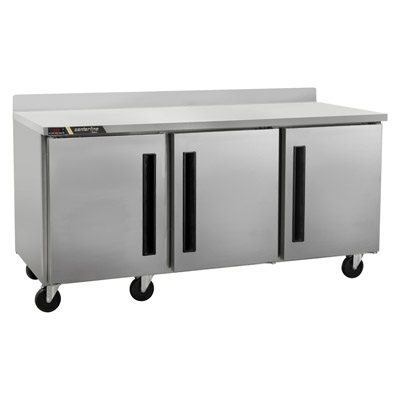 Centerline™ Compact Undercounter Refrigerator with Work Top, three-section, 72″ W, 18.80 cu. ft. capacity, self-contained rear-mount refrigeration, (1) left hinged/ (2) right hinged solid doors (field reversible), electronic control with LED display, (2) epoxy coated shelves per section, 4″ backsplash, stainless steel exterior, anodized aluminum interior, (4) casters, R450A refrigerant, 1/4 HP, 115v/60/1-ph, 3.6 amps, NEMA 5-15P plug, cETLus, ETL-Sanitation, ENERGY STAR®
